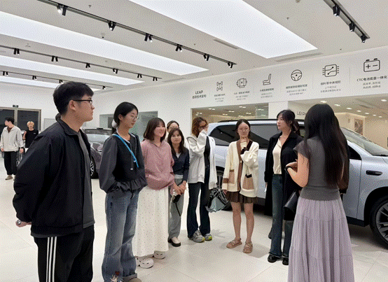 理论课堂后,学生在工作人员的带领下前往园区门店实习考察。通过近距离观察汽车展厅布局、车型陈列和直播演示,学生直观感受到营销策略在实际运营中的应用实现。此外,学生还与一线营销人员展开热切交流,进一步弥合了课堂教学与企业实践的认知差距。